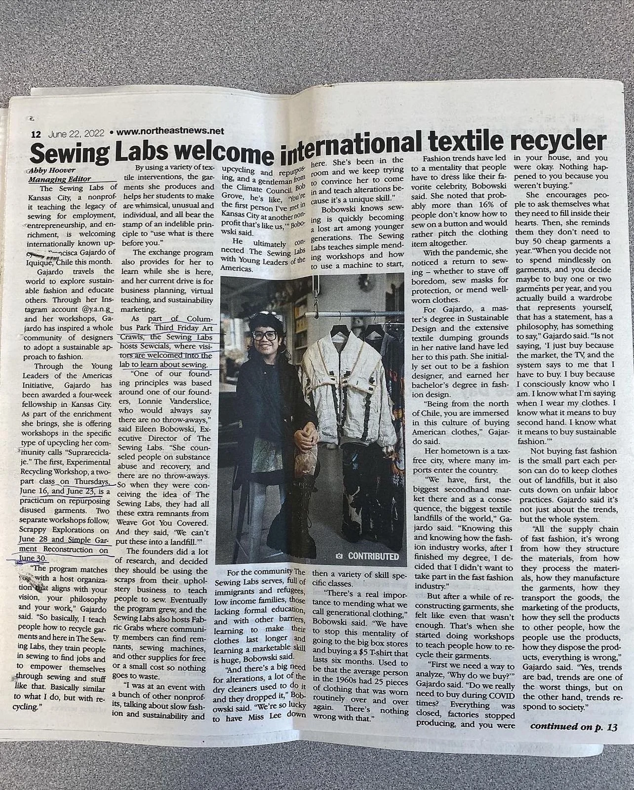 (…) The Sewing Labs of Kansas City, a nonprofit teaching the legacy of sewing for employment, entrepreneurship, and enrichment, is welcoming internationally known upcycler Francisca Gajardo of Iquique, Chile this month.